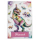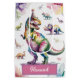 Esta tierna bolsa de regalo de dinosaurios personalizada incluye un lugar para agregar un nombre. Este diseño también incluye adorables gráficos de dinosaurios alrededor de una bonita T-rex rosa en un gorra de cumpleaños. Con una combinación de colores rosa y morado, este diseño de bolsos de regalo es perfecto para cualquier cumpleaños de chica.
