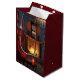 Un acogedor rincón de lectura en un día lluvioso de otoño. Alrededor de la chimenea hay unos sillones rojos mullidos, con pilas de libros y tartas y una tetera para completar el confort. En el exterior, un sauce amarillo y una cubierta roja de arce y hayas se ven oscurecidos por la lluvia que sopla la ventana, donde un gato jengibre se sienta mirando hacia afuera.