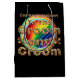El diseño es moda, moderno, sencillo y elegante; una bolsa de regalo de boda negro con falsos rosas de oro y letras. Un gran círculo de colores de orgullo arcoiris subyace al guión y a los rosas. El mensaje en ambos lados dice: "Felicitaciones al Groom y al Groom". Elija otro color de fondo, si lo desea. Para el boda o la parte de compromiso. Usar con la etiqueta de regalo correspondiente.
