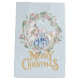 Hermosa bolsa de regalo de Navidades con nuestro trío de osos polares sentados dentro de un Navidad corona y atrevida, letras de oro deseando al destinatario una Feliz Navidad al fondo.