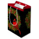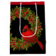 Esta bolsa de regalo de vacaciones para Navidades se muestra en negro con un guarnecido rojo y una corona festiva y una huella de arte de pájaro cardinal. Personalizar este artículo o compra tal cual.