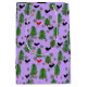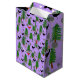 Esta divertida bolsa de regalos ofrece una escena de verano en el bosque, con pájaros negros, pájaros rojos, setas y pinos sobre un fondo morado con puntos grises y marcas claras.