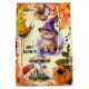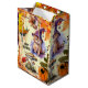Bolsa de regalo con un gatito vestido de bruja de Halloween, rodeada de hojas coloridas, hongos y una calabaza con araña. Excelente como regalo o para golosinas :-)