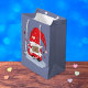 Una bolsa de regalo gris azul con un gnomo dulce vestido con un traje rojo con puntos de polka rosados . © ArianeC Ilustraciones-Todos los derechos reservados