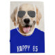 Perro Golden Retriever con camiseta azul y gafas de sol aviador por 85 años. La edad de nacimiento es editable. Se puede cambiar el fondo.