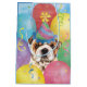 Felices saludos de cumpleaños con este diseño que incluye un lindo cachorro de Bulldog de gorra fiesta rodeado de globos coloridos, confetti y serpentines.