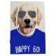 Perro Golden Retriever con camiseta azul y gafas de sol aviador por 60 años. La edad de nacimiento es editable. Se puede cambiar el fondo.