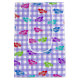 Coloridas chanclas sobre fondo de gingham blanco y violeta.