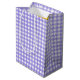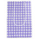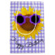 Girasol amarillo con gafas de sol de polika púrpura sobre fondo de gingham morado y blanco.