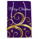 Esta bolsa de regalo se muestra en un fantástico movimiento de colores dorados y estrellas con el texto navideño Feliz en el frente. Se muestra en morado y en tono dorado.