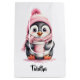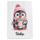 Un pequeño pingüino adorable con gorra de abejas rosas y bufanda sosteniendo una taza de café humeante. Personalizar con nombre o monograma. Para los amantes de los animales y del café.