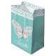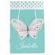 Bolsa de regalo de tamaño medio para personalizados de moda hecha en el huevo azul de robin, con gráficos de una mariposa blanca bonito, en la parte delantera y trasera, y banda de puntogramas de polka, alrededor de la parte superior. Personaliza el texto blanco, en la parte delantera del bolso, para leer lo que quieras. Hay una gran bolsa de regalo y papel de tejido a juego.