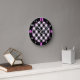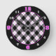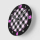 Las franjas de intersección negra sobre un fondo blanco para crear un diseño de tipo de argyle. Las líneas punteadas rosadas resaltan los cuadrados. Un anillo negro exterior es el fondo de los números para marcar las horas. Los números rosas más grandes marcan cada cuarto de hora.