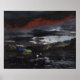 Atardecer y amanecer del sol de medianoche en el río Yukón, ilustrado en un cuadro de una balsa de madera. Los cisnes de Tundra se dirigían a una isla que se extiende a lo largo de las oscuras aguas agitadas, en el corazón del vasto desierto de Alaska. A medida que un día espantoso y lleno de lluvia terminaba con colores repentinos, oscuros pero vívidos, una luz plateada brillaba en el paisaje, centrándose en la escena que se avecina. Algunas de las nubes se volvieron un rojo intenso al separarse. La distancia hacia adelante estaba apenas iluminada en una profunda violación, brillando en la oscuridad. Las montañas y los bosques pasaron a la deriva en poderosas corrientes, hasta llegar a este destino que era el lugar para quedarse hasta mañana.