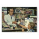 Ilustración vintage de ciencia e imagen empresarial. Diseño de atención médica que presenta a un niño que lleva una receta de medicamentos a un farmacéutico. La niña está comprando en una farmacia para que su familia pueda recuperarse. La homeopatía sería un método alternativo para sanar y obtener salud.