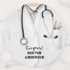 Decoración creativa de fiestas de salud para celebración de graduados de médicos o escuelas de medicina que incluye bata de laboratorio médico y estetoscopio. Para personalizar el texto de edición para agregar el nombre del médico.