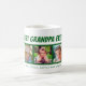 Este tazón de café muestra el texto en negrita "Mejor Papá Nunca" y tres fotos de fotos de nietos o abuelo. El texto en negrita verde "Mejor abuelo jamás" aparece encima de las fotos y el texto personalizado debajo de las fotos permite personalizar con los nombres.