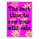 Esta graciosa tarjeta de cumpleaños dice: "¡El mejor momento para sembrar la avena salvaje es cuando se garantiza la pérdida de cosechas!" Este gracioso saludo de cumpleaños es para hombres y mujeres de todas las edades—todo depende de lo que esté pasando. Y algo debería estar pasando.