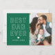Celebra el día especial de tu padre dándole una elegante tarjeta de fotos del Día del Padre. La moderna tarjeta del Día del Padre tiene un fondo verde, la frase "Mejor Papá Nunca" en un tipo de letra elegante, marcadores de posición para el texto y la foto de tu personalizado, y un patrón geométrico verde y blanco en la parte posterior de la tarjeta.