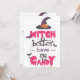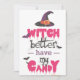 Este divertido y gráfico diseño presenta la frívola frase "Mejor que la bruja tenga mi dulce" en negrita, con letras negras rosadas y poco claras. Encabezado con un clásico gorra de bruja morada y rodeado de murciélagos voladores y un palo de escoba, es una imprenta de Halloween captante y caprichosa perfecta para camisetas, carteles o decoración fiesta — ¡una amenaza desenfadada que a todos los trucos o tratantes les encantaría hacer!