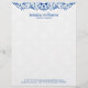 Elegant blue vintage floral swirl design over a white plush damask background.