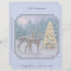 Un gallo blanco y una pala de agua se encuentran en un claro rodeado de un bosque de abetos y pinos, con ramas llenas de nieve. En medio del claro hay un árbol de Navidad decorado con cálidas luces de vacaciones brillando por la nieve para alegrar la noche de invierno oscura. Obra de arte realista creada a partir de una pintura al óleo original de la artista de vida silvestre Crista S. Forest.