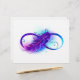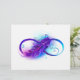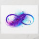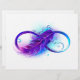 Símbolo infinito con una hermosa pluma pintada de color violeta y azul brillante sobre fondo blanco.