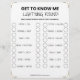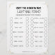 Rápido, divertido y lleno de personalidad — este juego Get to Know Me Lightning Round es la forma perfecta de romper el hielo! Los jugadores rodean sus elecciones rápidas y comparan las respuestas para descubrir lo similares (¡o diferentes!) que son en realidad. Ideal para aulas, fiestas, equipo o noches de juego. ✔️ hoja imprimible de 8,5" x 11" ✔️ Funciona para más de 2-20 jugadores ✔️ Fácil, atractivo y garantizado para iniciar la conversación!