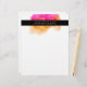 Elegant modern letterhead design displays your name and/or business name with two lines of contact information in white on a black stripe, overlaid on a watercolor inkblot element in fuchsia pink and golden orange.