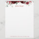 Una acuarela floral de papel de membrete con una acuarela pintada de peonías rojas profundas y pulverizaciones de eucalipto plateado.