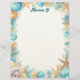Blue, tan, and pale gray shells and sea stars, interspersed with feathery and ferny seaweed and coral, makes this nautical-themed stationery perfect for anyone who loves the beach and the ocean.