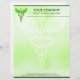 © Sunny Mars Designs - Green Caduceus Alternative Medicine 8.5" x 11" Business Letterhead - Médico membrete de negocios con el símbolo Caduceus modificado con hojas y viñas en lugar de alas y serpientes, contra fondo verde y blanco. Personalízalo añadiendo tu propio nombre de negocio y detalles. Concepto de medicina alternativa o uso combinado de medicina alternativa y prácticas médicas convencionales.