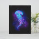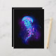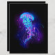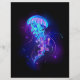 Gran medusa azul, de dibujo artístico, brillante y brillante, con largos tentáculos sobre fondo negro con bioluminiscencia violeta. Luminosas medusas.