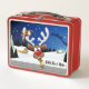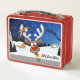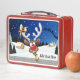 Un divertido reno de dibujos animados con una nariz roja brillante y grandes cuernos blancos, adornado con un lazo rojo y dorado, se asoma por una ventana abierta. Fuera, un paisaje nevado con siluetas de pinos y una pequeña casa iluminada es visible bajo un cielo nocturno azul oscuro lleno de estrellas. El trineo de Santa tirado por renos vuela en la distancia. La escena evoca una atmósfera navideña festiva y caprichosa. Arte Vectorial Original Copyright BluedarkArt TheChameleonArt.