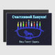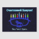 Una menorá de Janucá con temática de león azul con velas encendidas superpuestas sobre un fondo estrellado. El texto cirílico (ruso) que dice "Счастливой Хануки!" (Schastlivoi Hanuki - Feliz Janucá) aparece en azul y blanco brillantes. Agregue su propio texto adicional en cirílico o cambie a una fuente en inglés.
