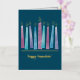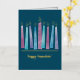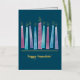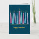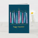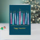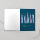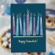 Comparte la alegría de la temporada con un diseño moderno y elegante, de color acuático Menorah. Las llamas y adornos del Relieve metalizado dorado hacen de esto una tarjeta Hannukah distintiva para todos en tu lista de correo.
