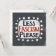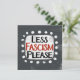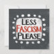 "Menos fascismo Por favor" es un lindo diseño de texto en gris con texto en negro y rojo, junto con una forma de acento blanco y puntos caprichosos de textura blanca que lo rodean.