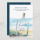 La boda de estilo exclusivo, salvo la tarjeta de fecha, incluye una escena de playa acuarela con un "mensaje en una botella" con las palabras "guardar la fecha" en la tipografía manuscrita de escritura de moda. Personalice con sus nombres y los detalles de su boda de playa o verano en la parte superior, incluyendo la fecha, la ubicación y el sitio web del boda. Las tarjetas se vuelven a azul de puerto sólido.