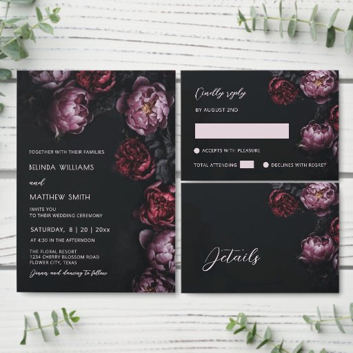 Menú 3D Purple and Dark Red Peony Wedding