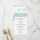 Los huéspedes podrán deleitarse con este elegante menú. El diseño es independiente, con un delicado fondo acuático, en una mezcla de tonos turquesa, acuático, azul polvoriento y verde suave tanto en la parte superior como en la parte posterior. Moderna caligrafía escrita a mano "Menú" sobre la elegante sección Turquesa Aqua. Detalles de caligrafía escrita a mano y elementos de oro. De vuelta con el fondo de las acuarelas y la sección turquesa, en este funda que recubre los nombres y fecha de la novia y del novio. También disponible en verde claro y en azul polvoriento. Parte de nuestra colección "Airy Blue and Green Watercolor" con una variedad de productos de coordinación disponibles.