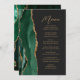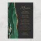 Este elegante y moderno menú boda se caracteriza por una pastilla de color verde esmeralda bordeada por un falso purpurina de oro. El texto de personalizable combina guiones de escritura a mano de color dorado y fuentes sans serif en un fondo fuera de negro. El diseño de las agatas verde y dorado se repite al revés.