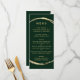 Este menú boda presenta un marco falso en forma de círculo dorado y una sencilla caligrafía con un fondo verde forestal.