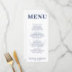 Menú de la recepción de bodas en blanco y azul náutico. Ideal para un boda de la Marina (militar) o de la casa del lago. El diseño presenta un ancla envuelto en un cartel con el texto "Anclado en el amor". Personalízalo con los detalles de su boda.