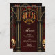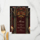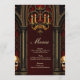 Arco gótico con calaveras. Un gran arco gótico se alza majestuosamente sobre un fondo rojo misterioso y profundo, decorado con detalles ornamentales. Los dos grandes pilares, adornados con delicados tallados, dan a la imagen una elegancia conmovedora. En el centro del arco brilla una impresionante vidriera, cuyo motivo central es una araña, símbolo de paciencia y creatividad. Rodeado por dos cráneos dorados, que recuerdan tanto a la transitoriedad como al amor eterno, el arco cautiva al espectador y promete una celebración llena de misterio y fascinación.