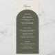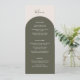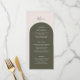 Presenta tu cena de recepción con esta elegante tarjeta de menú bohemio, diseñada para coordinar con la colección de boda Sage Green Rustic Arch, ofreciendo un giro fresco en el look característico. La parte frontal presenta una curva de arco verde oscuro básico que enmarca elegantemente los detalles de la comida, incluyendo aperitivos, selecciones de plato principal y postres, todo sobre un fondo beige suave. Diseño retro. Esta sutil variación crea un rico y natural telón de fondo que permite que la información del menú tome el centro del escenario.