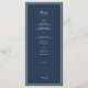 Antecedentes náuticos azules para un diseño simple pero elegante basado en la tipografía. Pie de monograma de la pareja. Blanco sobre azul marino oscuro. Vuelve al color azul sólido. La tarjeta de menú tiene tipos de letra variados y adornos de una sola línea bajo "Menú". Un aspecto muy náutico tanto en color como en tipografía.