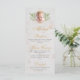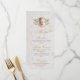 Un menú de bautismo neutral de género con fondo de mármol blanco y elegante guión caligráfico dorado para títulos y subtítulos. Encima del texto, hay una foto de bebé reemplazable en un marco de oro irregular de dos hexágonos de oro que se superponen, con una cruz de oro en su parte superior y hojas de sauce verdes a la derecha y a la izquierda del marco. La parte trasera es de mármol blanco. La foto de una niña en el marcador de posición es de Amy Elizabeth Quinn de Pixabay y es gratis para uso comercial. Las ramas de sauce son del patrón vintage de papel pintado "Willow Bough" diseñado por William Morris (1834-1896 ), ahora de dominio público.