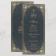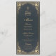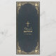 Este elegante menú vintage de bautizo de niño con un aire antiguo tiene en ambos lados un marco decorativo dorado barroco sobre un fondo azul oscuro. El nombre, el título "Menú" y los subtítulos están escritos en una tipografía caligráfica. Todo el texto se puede personalizar y tiene un color dorado similar al marco dorado. Hay una cruz dorada sobre el texto.