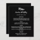 Un fondo negro clásico. Texto blanco. Personalice y agregue su nombre, fecha y menú. Puede añadir más texto, fotos en la parte posterior. 1 hoja = 1 borde impreso del menú a borde.