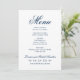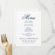 El diseño formal de la tarjeta de menú boda azul marino presenta una hermosa tipografía que combina un guión de caligrafía floreciente tradicional con letras de bloques clásicas. Incluye un acento de diseño de desplazamiento decorativo. El texto del personalizado puede ser personalizado con un monograma de los nombres de la novia y del novio y la fecha del boda, así como los detalles del menú de la cena para el día de la boda. Por favor, compre nuestra Colección de Bodas Azul de la Marina Elegante Clásica para coordinar diseños.